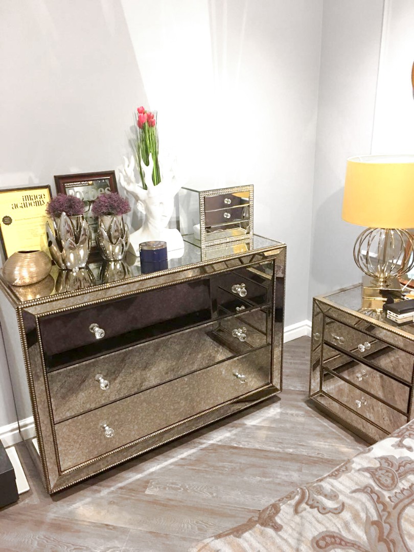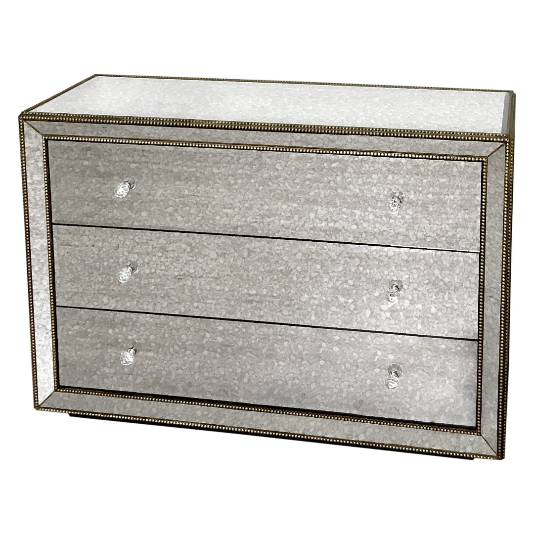Зеркальный комод в вашем доме - это уникальный предмет. Он абсолютно универсален и впишется практически в любой стиль. Его зеркальная поверхность отражает все вокруг, что позволяет решить такую зачастую важную задачу в дизайне интерьера, как визуальное расширение пространства. Изящные аксессуары, фацет по всем краям зеркал и декоративные шарики, выкрашенные в состаренный серебряный цвет - все это результат труда наших искусных мастеров. Комод изготовлен вручную и состоит из каркаса и трех выдвижных полок с доводчиками, слегка посаженных вглубь. Цвет выкраса внутри полок - черный, глубина комода 45 см. Комод поднят над полом на 6 см за счет подставки, являющейся основанием. Мы с удовольствием изготовим для вас на заказ комод в нужном вам размере, цвете, рисунке состаренного зеркала и с нужными декоративными элекментами. Зеркальный комод Hugo серебро